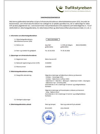 At Metro Service, we comply with a number of international standards, several of which we are also certified in. These include ISO 9001, ISO 14001, ISO 27001, and ISO 55001, and we are of course approved by the Danish Transport Authority.