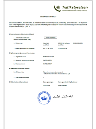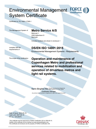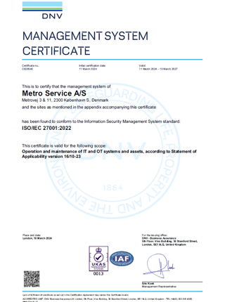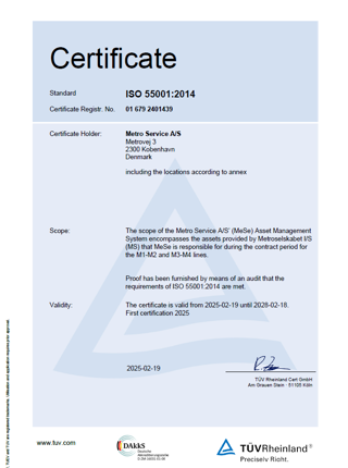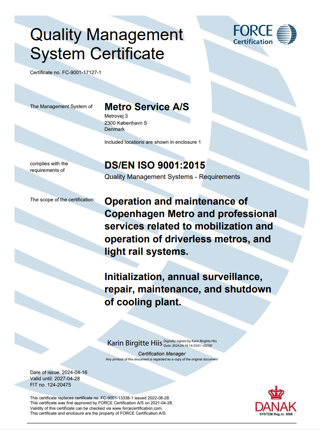 I Metro Service lever vi op til en række internationale standarder, og flere af dem er vi også certificeret i. Herunder ISO 9001, ISO 14001, ISO 27001 og ISO 55001, ligesom vi naturligvis er godkendt af Trafikstyrelsen.