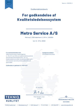 I Metro Service lever vi op til en række internationale standarder, og flere af dem er vi også certificeret i. Herunder ISO 9001, ISO 14001, ISO 27001 og ISO 55001, ligesom vi naturligvis er godkendt af Trafikstyrelsen.